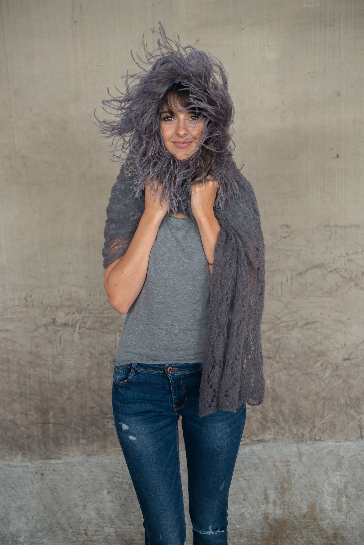 This stunning and unique lace knit shawl adds a dash of drama to any outfit. Made from Kid Mohair with Ostrich feather trim. Warm and super luxurious. Turns any little black dress into a dramatic outfit! Wear it with jeans for a dash fun color.